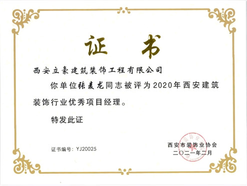 我公司資深項(xiàng)目經(jīng)理桂志平、高明明、張麥龍被評為2020年西安建筑裝飾行業(yè)優(yōu)秀項(xiàng)目經(jīng)理。